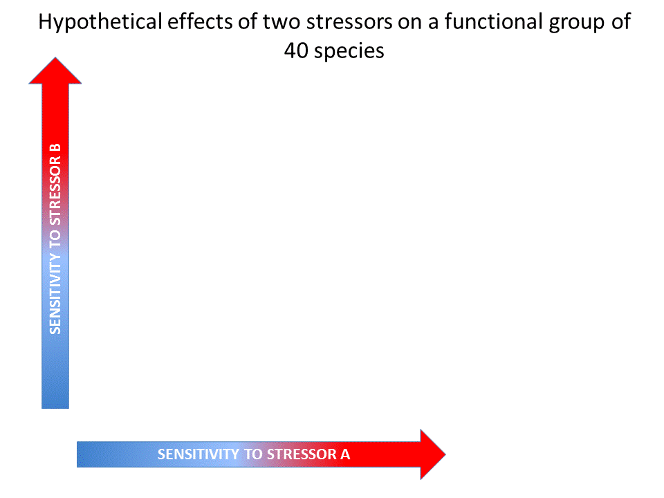 The insurance hypothesis (Naeem 1998, Yachi & Loreau 1999) is based on the concept of species redundancy and predicts that biological communities comprised of functional groups with many species allow for ecosystem functioning being more resistant to species loss due to anthropogenic stress. This increased resistance results from other species belonging to the same functional group that are tolerant to the stressors causing species loss and thus functionally compensate for the species that have gone extinct. This explains the evidence from literature that the impact of a stressor is less pronounced at the functional level than at the species level (e.g. Jackson et al 2016).